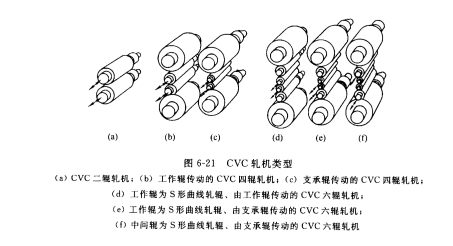 CVC軋機(jī)分為CVC二輥軋機(jī)、CVC四輥軋機(jī)和CVC六輥軋機(jī)三種,輾系示意圖如圖6-21所示。CVC四輥軋機(jī)的工作輥為S形曲線軋輥,而CVC六輥軋機(jī)的S形曲線軋輥可以