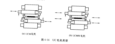 四輥軋機工作輾的撓度如圖 6-17 所示。由于在工作輥與支承輥的接觸壓扁上存在著有害的 A 區(qū),即大于軋制帶材寬度的工作輥與支承輥的接觸區(qū),因此,在 A接觸區(qū)的接觸應力形成一個使軋輾撓度加大的有害彎矩。這樣工作輥的撓度不僅取決于軋制力,而且也取決中間輥彎輥裝置。根據(jù) HCM六輥軋機的形式增加中間輥彎輥裝置的 UC軋機稱為 UCM 軋機廠圖6-16(a),而具有中間輥和工作輥都能抽動又有中間輥彎曲裝置的 UC軋機稱為UCMW軋機「圖 6-16(b)。UC軋機比 HC軋機具有更大的壓下量和更強的板形控制能力,可以軋制更薄、更寬、更硬的板帶,并能較好地控制復合浪形和邊部減薄量,適合于軋制薄而寬且具有一些特殊要求的板材。