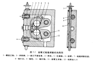 ④ 軋輥軸安裝在搖臂里(見(jiàn)圖 7-7),能夠在一個(gè)較大的范圍內(nèi)對(duì)稱調(diào)整輥縫,從而使軋制線保持恒定。這對(duì)于穩(wěn)定軋制工藝,減少生產(chǎn)事故,提高軋機(jī)作業(yè)率是十分有利的。輥縫的對(duì)稱調(diào)整是通過(guò)蝸桿蝸輪帶動(dòng)調(diào)整楔水平往復(fù)移動(dòng),使裝在上下?lián)u臂中的軋輥軸繞搖臂支承軸轉(zhuǎn)動(dòng),再加上液壓平衡缸的作用而實(shí)現(xiàn)的。