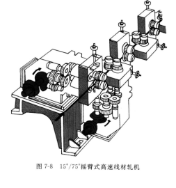 德馬克無(wú)扭高速線材軋機(jī)與摩根軋機(jī)一樣,采用偏心套式的輥縫調(diào)整機(jī)構(gòu)和外齒傳動(dòng),則在調(diào)整輥縫時(shí)必然引起軋輥軸齒輪嚙合中心發(fā)生變化。克虜伯軋機(jī)為了克服軋輥軸齒輪嚙合中心變化的缺點(diǎn),在采用偏心套式輯縫調(diào)整機(jī)構(gòu)的同時(shí),采用了內(nèi)齒輪傳動(dòng)。而目采用偏心套式輥縫調(diào)整機(jī)構(gòu)在結(jié)構(gòu) 上縮小了軋輥軸的軸頸直徑,從而限制了精軋的能力。實(shí)踐證明,偏心套座孔由于長(zhǎng)期的脈動(dòng)載荷作用而易于磨損,致使配合松動(dòng),引起沖擊和扭振,高速時(shí)更甚。為此,德馬克公司設(shè)計(jì)了一套搖臂式調(diào)整輥縫的高速線材軋機(jī),如圖7-7 所示。軋機(jī)的布置形式有兩種∶一種與摩根式的相仿,各相鄰機(jī)架間互相成 90°角布置,且各自與水平面交替上下成45°角;另一種布置形式是各相鄰機(jī)架間仍然互相成 90°角布置,但各自與水平面交替上下成 15°/75°角,如圖7-8 所示。軋機(jī)的增速箱與分速箱結(jié)合起來(lái),在一個(gè)箱殼里。