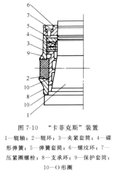 ⑧自 20世紀(jì)80 年代以來(lái),采用了專門(mén)設(shè)計(jì)的被稱為"卡菲克斯"的新型輥環(huán)緊固裝置,如圖 7-10 所示。它與標(biāo)準(zhǔn)的輥環(huán)緊固裝置相比較,使碳化鎢輥環(huán)軋槽壽命從4 000t/mm 直徑提高到9000~11000t/mm 直徑,軋輥輥環(huán)更換的時(shí)間間隙大大增加了。