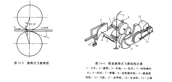 圖 10-4所示為某廠小型車間簡易滾筒式飛剪結(jié)構(gòu)示意。它安裝于φ320機(jī)列與9250機(jī)列之間的輸送輥道上,用來對(duì)運(yùn)動(dòng)著的軋件進(jìn)行切頭或切除有缺陷的部分。
