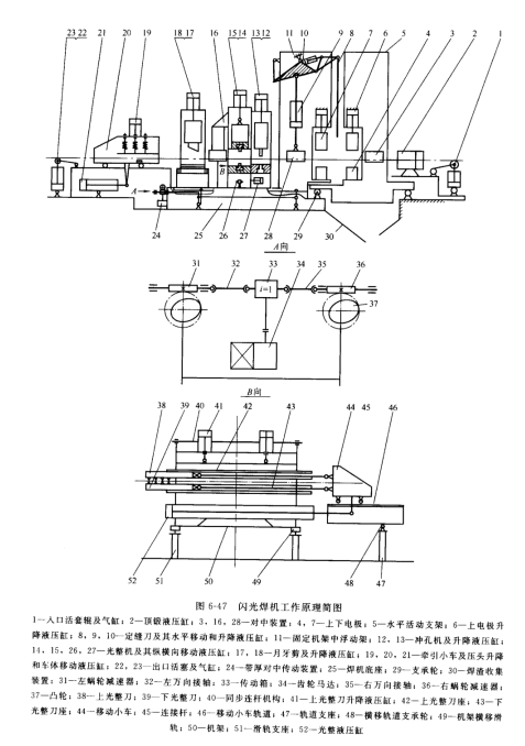閃光焊機(jī)由電機(jī)及焊接裝置,焊縫定位裝置,帶鋼與機(jī)組線對中裝置,沖孔裝置,光正裝置,月牙剪,帶鋼板厚對中裝置機(jī)焊渣收集裝置組成,圖6-47所示為閃光焊機(jī)工作原理簡圖。