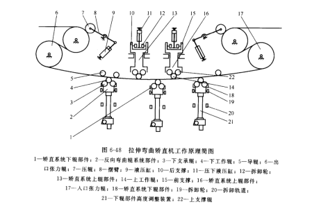 圖 6-48 所示為拉伸彎曲矯直機(jī)工作原理簡圖。拉伸彎曲矯直機(jī)由張力輥及張力輥主傳動裝置、壓輥裝置、上矯直輥裝置和下矯直輾裝置組成。