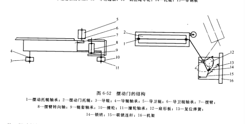 擺動門上的擺動托輾用以托住帶鋼板,起到托輥作用。該輪位于活套車運動的水平線上, 當(dāng)活套車運行到該輥處時,托輾必須打開,兩個擺動托輥向兩側(cè)分開,故稱為擺動門。當(dāng)活套車返回,并且過了該輥后,擺動門自動關(guān)閉,繼續(xù)托著活套車后面的帶鋼板。圖 6-52所示為擺動門的結(jié)構(gòu)。